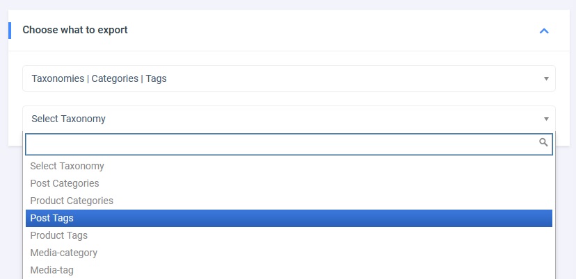 Das Plugin muss auf allen Internetseiten installiert und aktiviert werden, auf welchen du etwas exportieren bzw. importieren möchtest. Natürlich müssen hierfür alle Seiten mit WordPress erstellt worden sein. Zunächst musst du nun auf der Seite, von welcher du die Daten benötigst, die Exportdatei erstellen und herunterladen. Nach der Aktivierung des Plugins erscheint links im WordPress-Menü der Punkt „WP Imp Exp„. Klicke hier auf „New Export„. Im Dropdown-Menü musst du nun auswählen, was du exportieren möchtest. Möchtest du beispielsweise ganze Beiträge exportieren, dann wähle Post. Willst du nur Kategorien oder Schlagwörter exportieren, dann wähle den Punkt Taxonomies | Categories | Tags. Anschließend öffnet sich ein zweites Dropdown-Menü, wo du den Export weiterhin auf ein bestimmtes Element begrenzen kannst. In unserem Fall wählen wir hier „Post Tags“ aus: