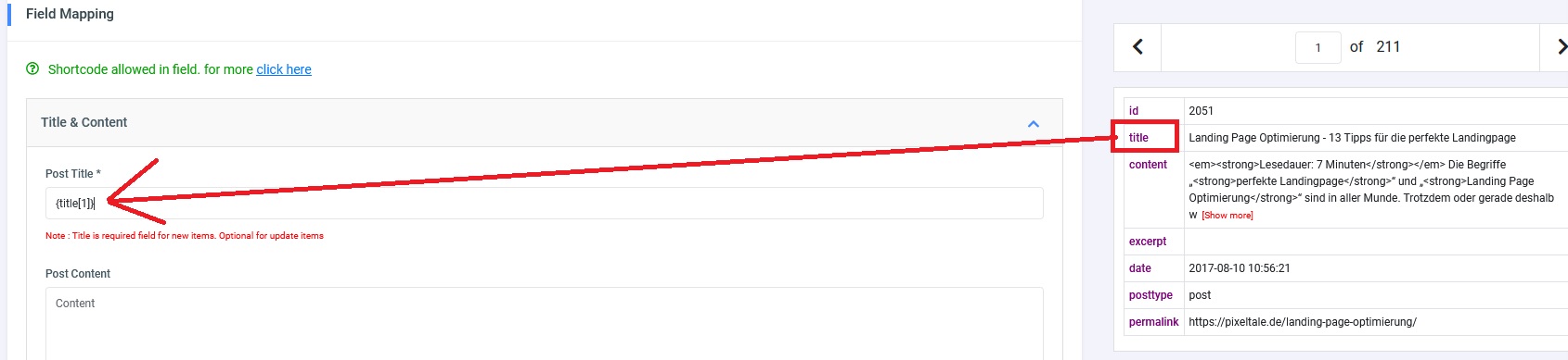 Klicke hierfür rechts mit der Maus auf „title“ und ziehe den Wert mit der Maus in das Feld „Post Title„:
