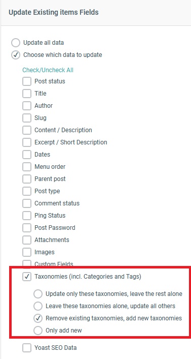 Unter „Update Existing Items Fields“ kannst du auswählen, ob alle Daten aktualisiert werden oder nur die von dir angeklickten. In meinem Fall wollte ich nur die Schlagwörter importieren und alles andere so lassen, wie es ist. Also wähle ich den Punkt „Taxonomies“ aus: